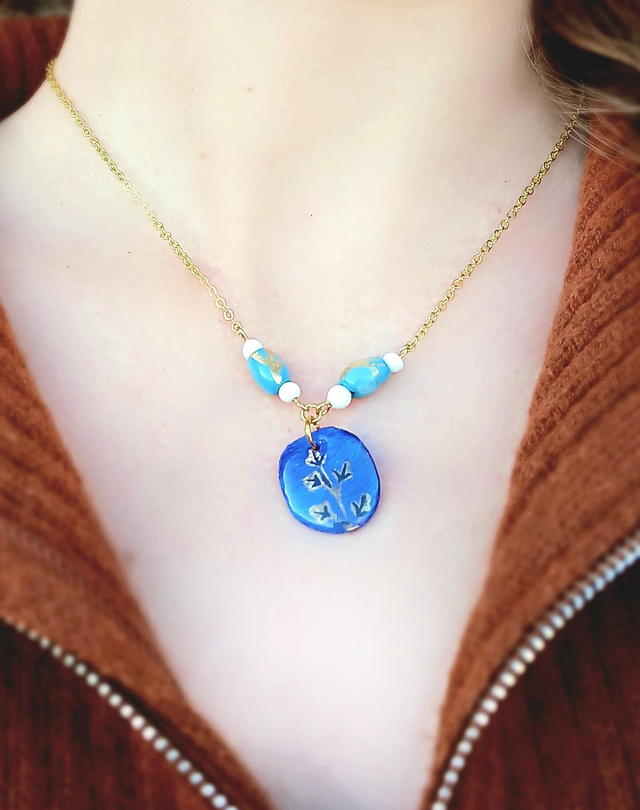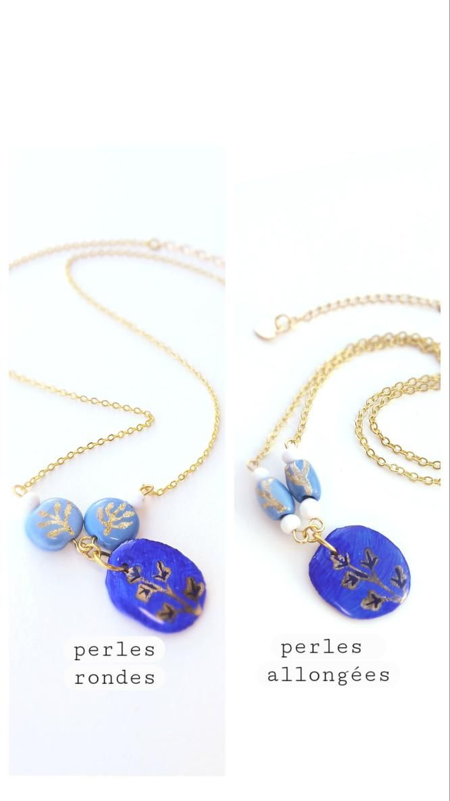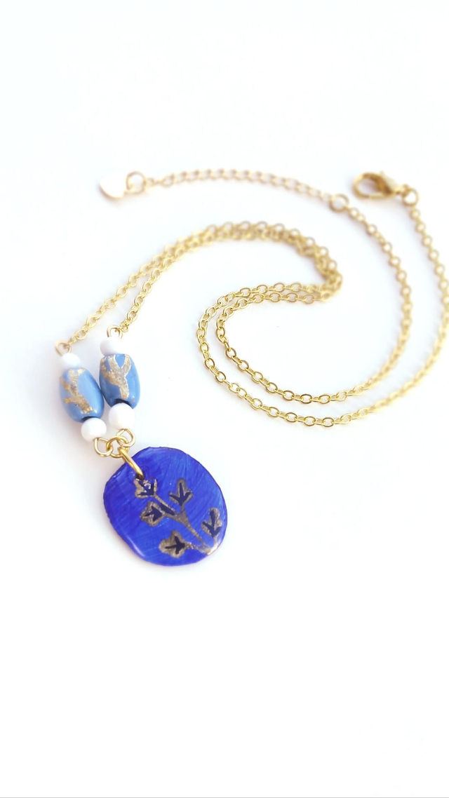 Ce collier plein de gaieté allie la délicatesse des motifs végétaux dorés à l'or et la vivacité du bleu outremer pour un bijou vibrant d'authenticité.